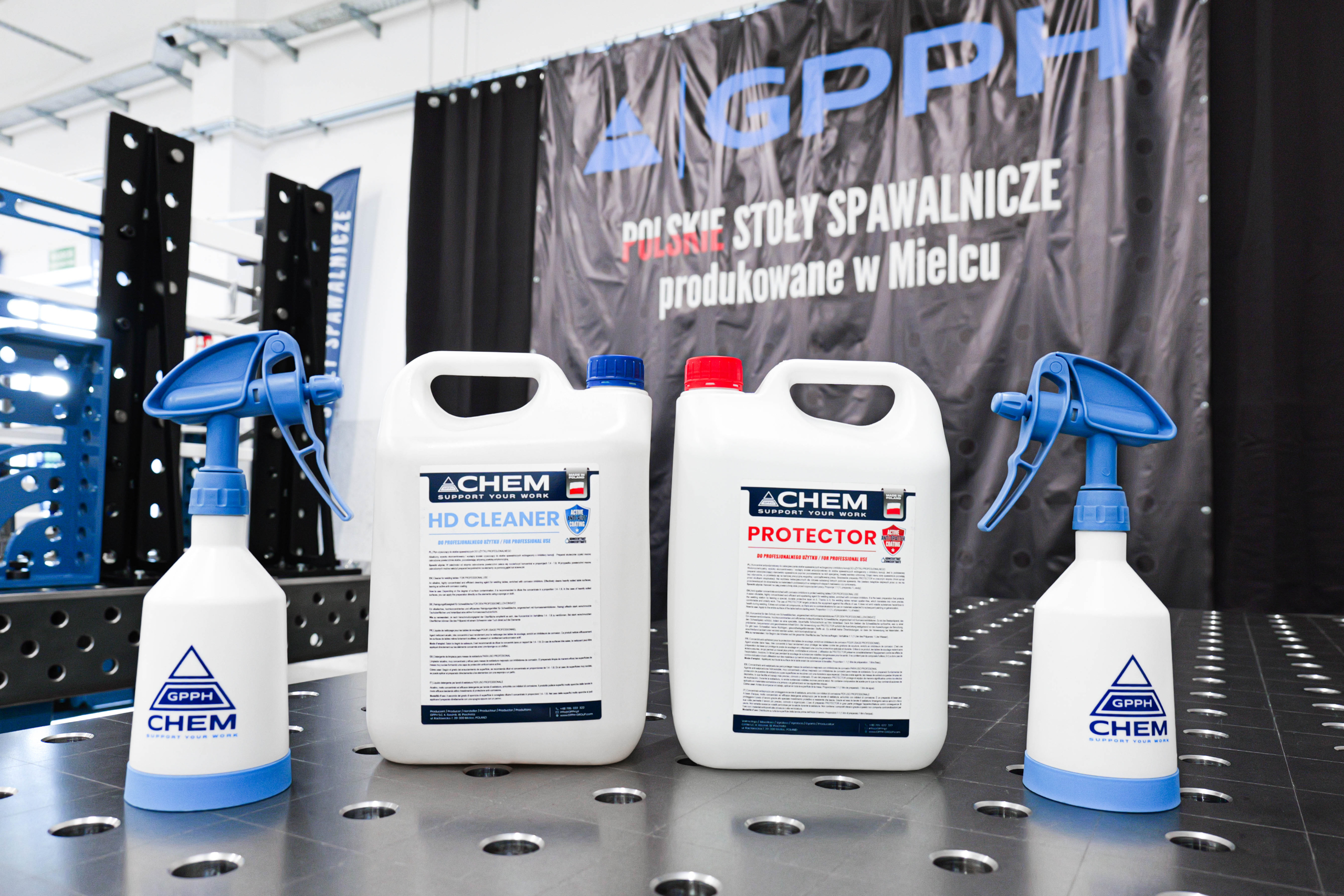 După terminarea lucrului, sudorul se ocupă de întreținerea echipamentului. Blatul mesei se curăță cu GPPH CHEM HD Cleaner, care îndepărtează murdăria, și cu PROTECTOR, care protejează suprafața împotriva coroziunii. Mesele bine întreținute își păstrează proprietățile timp de ani de zile, iar suprafața de lucru precisă nu necesită retușuri sau frezare. Nu este doar o chestiune de estetică, ci o economie reală – de timp și costuri de întreținere.