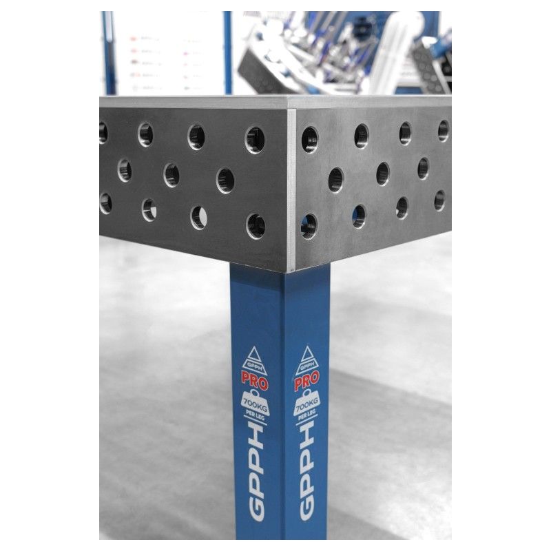 Benene i PRO-svejsebordene, der er fremstillet af 100x100 mm-profiler, har en belastningskapacitet på 700 kg/ben. I 3000x1480 mm-versionen, som har otte 8-ben, får du en maksimal belastningskapacitet på 5 600 kg.