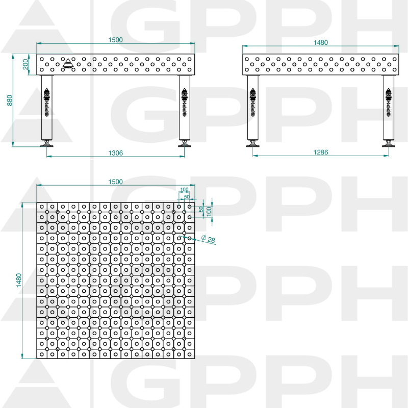 Les tables de soudage doivent être plates! Les plans de travail des tables PRO, d'une épaisseur de 15 mm, ont des nervures denses, ce qui a un impact sur la planéité de la surface de travail. Une sous-structure massive et rigide du plan de travail assure une stabilité maximale pendant l'utilisation et une protection contre la déformation. La tolérance de planéité pour l'ensemble de la table est de ±0,3 mm*. La table 1500x1480 mm comporte 3 nervure dans le sens de la longueur et 3 nervures dans le sens de la largeur.