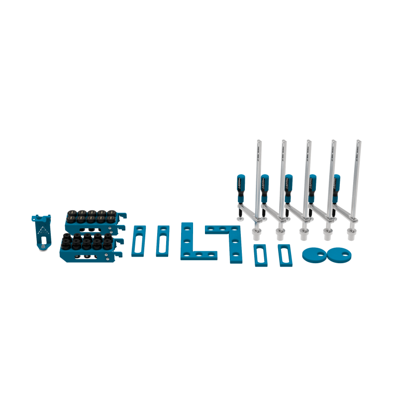 El juego más compacto de la gama: solo contiene las herramientas más importantes para la fijación y el posicionamiento básicos. Se utiliza cuando el espacio y la movilidad son fundamentales, por ejemplo, en trabajos de mantenimiento, montaje o en puestos de trabajo con espacio reducido. A pesar de su reducido tamaño, ofrece un apoyo sólido para trabajos de soldadura ligeros.
