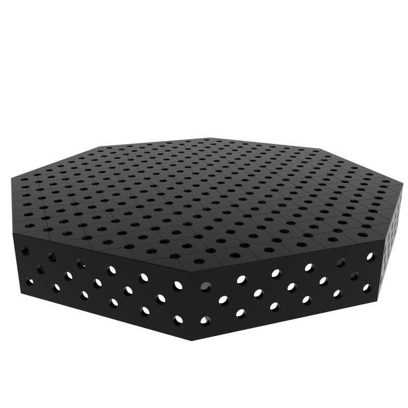 Dankzij de gefreesde en afgeschuinde gaten in het bovenblad van de Octagonale tafel wordt het monteren en demonteren van gereedschap tijdens het werk eenvoudiger, omdat de gaten perfect aansluiten op het gereedschap. Dit draagt ook bij aan een verminderde slijtage van het gereedschap - er is weinig inspanning nodig tijdens het monteren en demonteren. Dit type ontwerp is de best beschikbare oplossing op de lastafelmarkt! De tolerantie van de uitvoering van de gaten is ±0,05 mm.
