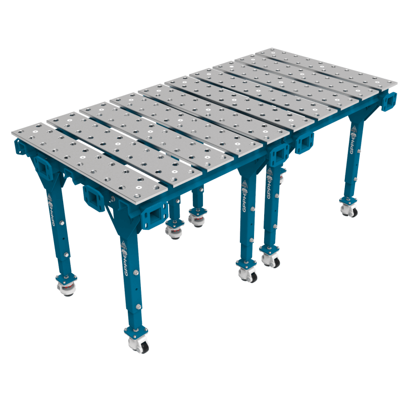 Het bovenblad van de modulaire tafels bestaat uit gefreesde, verschuifbare platen met een dikte van 15 mm, en door hun oppervlak aan te passen krijg je perfecte vlakheid. Ze zijn gemaakt in een systeem van gaten fi 28 mm in een raster van 100x100 mm.