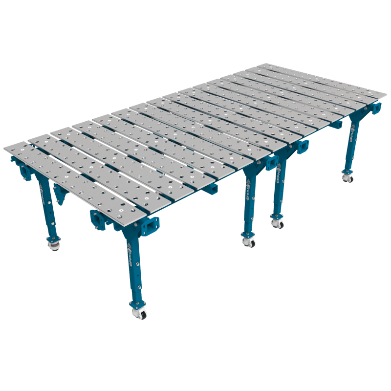 Modulaire tafels hebben wielen met een voet in de basispoten, met een draagvermogen van 250 kg per poot.
