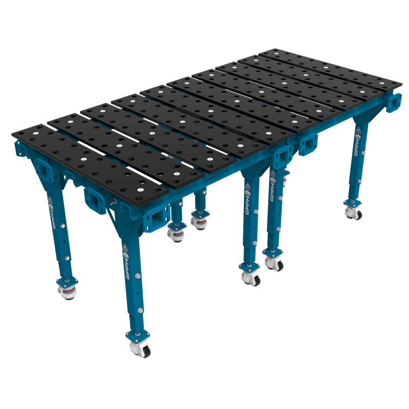 Het bovenblad van de modulaire tafels bestaat uit gefreesde, verschuifbare platen met een dikte van 15 mm, en door hun oppervlak aan te passen krijg je perfecte vlakheid. Ze zijn gemaakt in een systeem van gaten fi 28 mm in een raster van 100x100 mm.