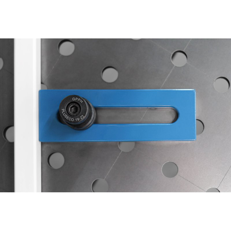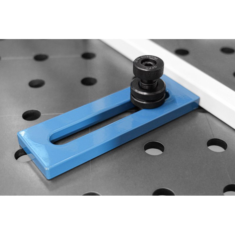 Hål i Anslag 150 möjliggör fastsättning med bult eller klämma. Ett slitsat hål gör det möjligt att fästa och positionera på bordet på valfri plats.