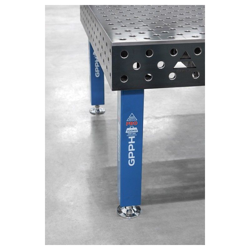 Føttene i PRO-sveisebordene, som er laget av 100x100 mm-profiler, har en belastningskapasitet på 700 kg/bein. Når det gjelder 3000x1480 mm-versjonen, som har åtte 8-ben, får du en maksimal belastningskapasitet på 5 600 kg.