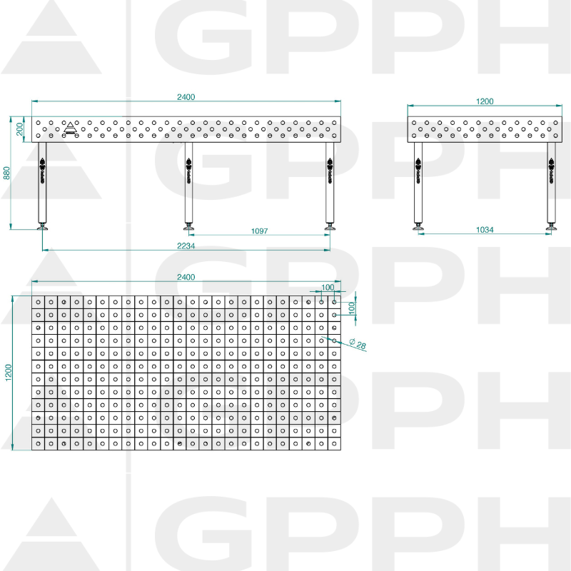 Sveisebordet må være flatt! Benkeplatene på ECO-bordene, som har en tykkelse på 8 mm, har en tett ribbing, noe som har innvirkning på den flate arbeidsflaten. En massiv og stiv underkonstruksjon av benkeplaten sikrer høyeste stabilitet under bruk og beskyttelse mot deformasjon. Toleransen på planhet for hele bordet er ±0,5 mm*, og toleransen på sveisebordets hull er ±0,1 mm. Bordet på 2400 x 1200 mm har 2 ribbe i lengderetningen og 5 ribber i bredden.